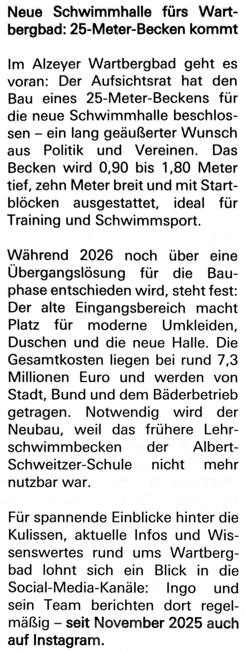 Lange dauerte die Durststrecke für den Alzeyer Schwimmsport im Winter. Wurde die Alzeyer Lehrschwimmhalle im Jahr 2020 zunächst wegen unerfüllbarer Coronaauflagen und ab 2023 wegen einer zu erwartenden Gasmangellage geschlossen, stellte man in der Folge fest, dass sie stark sanierungsbedürftig ist und eine Renovierung wirtschaftlich nicht vertretbar sei.